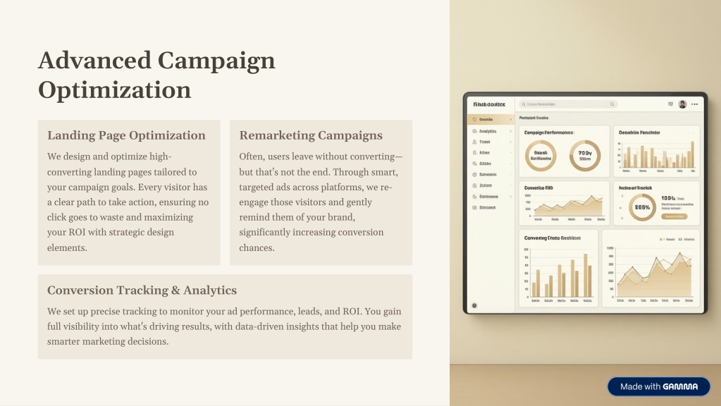 4. Advanced Campaign Optimization Landing Page Optimization Remarketing Campaigns We design and optimize high- converting landing pages tailored to your campaign goals. Every visitor has a clear path to take action, ensuring no click goes to waste and maximizing your ROI with strategic design elements. Often, users leave without converting— but that's not the end. Through smart, targeted ads across platforms, we re- engage those visitors and gently remind them of your brand, significantly increasing conversion chances. Conversion Tracking & Analytics We set up precise tracking to monitor your ad performance, leads, and ROI. You gain full visibility into what's driving results, with data-driven insights that help you make smarter marketing decisions.