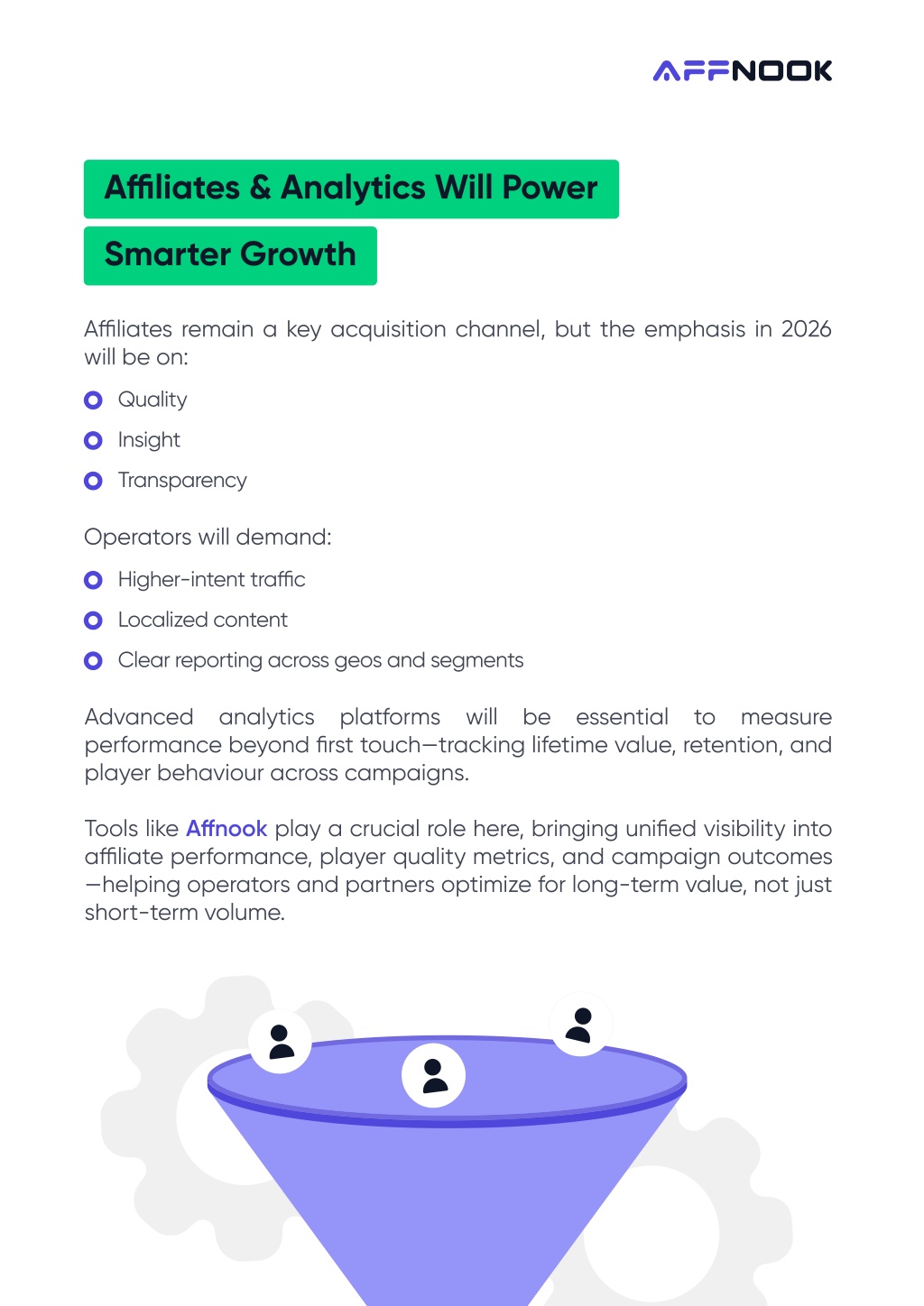 7. Affiliates & Analytics Will Power Smarter Growth Affiliates remain a key acquisition channel, but the emphasis in 2026 will be on: Quality Insight Transparency Operators will demand: Higher-intent traffic Localized content Clear reporting across geos and segments Advanced analytics platforms will be essential to measure performance beyond first touch—tracking lifetime value, retention, and player behaviour across campaigns. Tools like affiliate performance, player quality metrics, and campaign outcomes —helping operators and partners optimize for long-term value, not just short-term volume. play a crucial role here, bringing unified visibility into Affnook