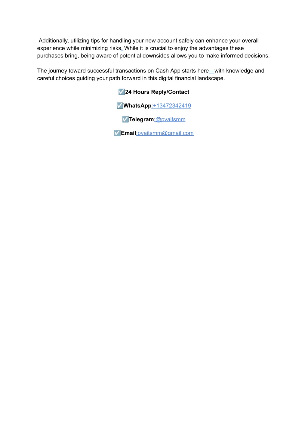 Additionally, utilizing tips for handling your new account safely can enhance your overall experience while minimizing risks. While it is crucial to enjoy the advantages these purchases bring, being aware of potential downsides allows you to make informed decisions. The journey toward successful transactions on Cash App starts here—with knowledge and careful choices guiding your path forward in this digital financial landscape. ☑24 Hours Reply/Contact ☑WhatsApp:+13472342419 ☑Telegram:@pvaitsmm ☑Email:pvaitsmm@gmail.com
