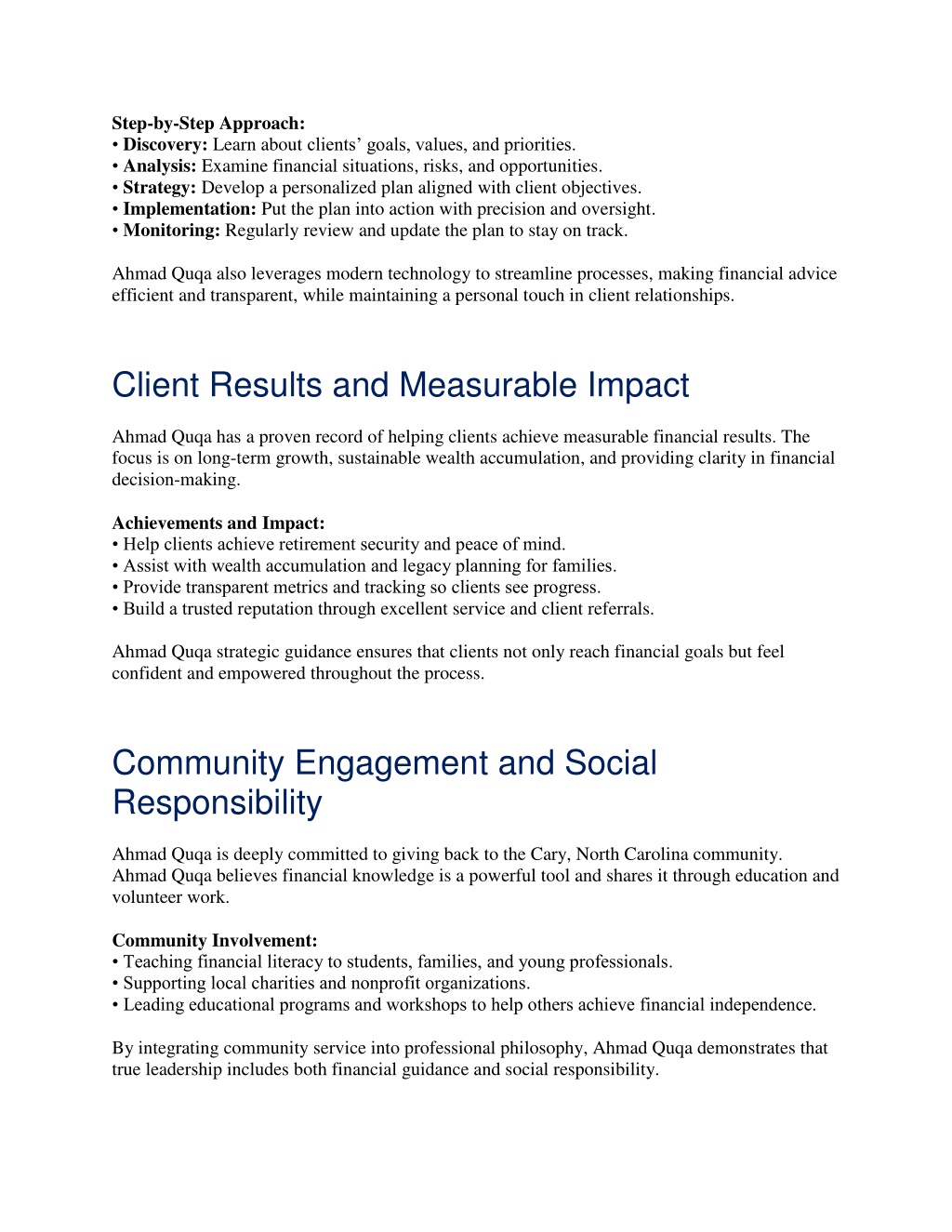 Step-by-Step Approach: •Discovery: Learn about clients’ goals, values, and priorities. •Analysis: Examine financial situations, risks, and opportunities. •Strategy: Develop a personalized plan aligned with client objectives. •Implementation: Put the plan into action with precision and oversight. •Monitoring: Regularly review and update the plan to stay on track. Ahmad Quqa also leverages modern technology to streamline processes, making financial advice efficient and transparent, while maintaining a personal touch in client relationships. Client Results and Measurable Impact Ahmad Quqa has a proven record of helping clients achieve measurable financial results. The focus is on long-term growth, sustainable wealth accumulation, and providing clarity in financial decision-making. Achievements and Impact: • Help clients achieve retirement security and peace of mind. • Assist with wealth accumulation and legacy planning for families. • Provide transparent metrics and tracking so clients see progress. • Build a trusted reputation through excellent service and client referrals. Ahmad Quqa strategic guidance ensures that clients not only reach financial goals but feel confident and empowered throughout the process. Community Engagement and Social Responsibility Ahmad Quqa is deeply committed to giving back to the Cary, North Carolina community. Ahmad Quqa believes financial knowledge is a powerful tool and shares it through education and volunteer work. Community Involvement: • Teaching financial literacy to students, families, and young professionals. • Supporting local charities and nonprofit organizations. • Leading educational programs and workshops to help others achieve financial independence. By integrating community service into professional philosophy, Ahmad Quqa demonstrates that true leadership includes both financial guidance and social responsibility.