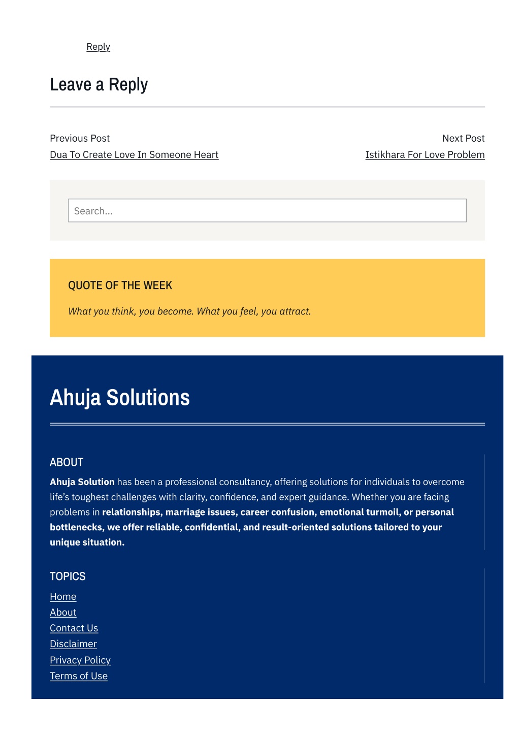 Reply Leave a Reply Previous Post Dua To Create Love In Someone Heart Next Post Istikhara For Love Problem Search... QUOTE OF THE WEEK What you think, you become. What you feel, you attract. Ahuja Solutions ABOUT Ahuja Solution has been a professional consultancy, offering solutions for individuals to overcome life’s toughest challenges with clarity, confidence, and expert guidance. Whether you are facing problems in relationships, marriage issues, career confusion, emotional turmoil, or personal bottlenecks, we offer reliable, confidential, and result-oriented solutions tailored to your unique situation. TOPICS Home About Contact Us Disclaimer Privacy Policy Terms of Use