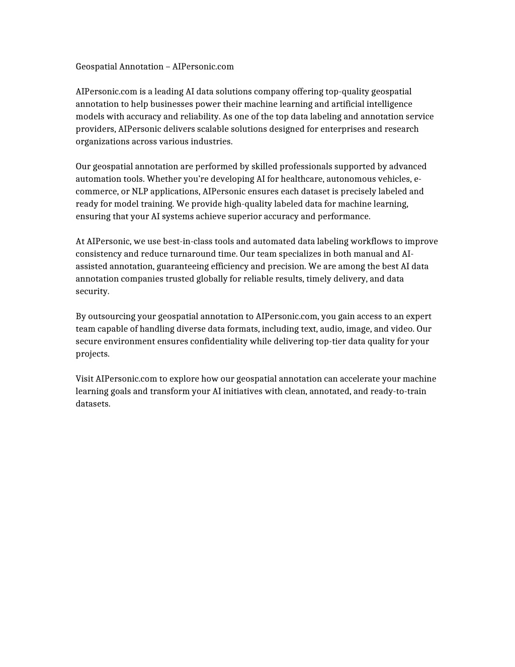 Geospatial Annotation – AIPersonic.com AIPersonic.com is a leading AI data solutions company offering top-quality geospatial annotation to help businesses power their machine learning and artificial intelligence models with accuracy and reliability. As one of the top data labeling and annotation service providers, AIPersonic delivers scalable solutions designed for enterprises and research organizations across various industries. Our geospatial annotation are performed by skilled professionals supported by advanced automation tools. Whether you’re developing AI for healthcare, autonomous vehicles, e- commerce, or NLP applications, AIPersonic ensures each dataset is precisely labeled and ready for model training. We provide high-quality labeled data for machine learning, ensuring that your AI systems achieve superior accuracy and performance. At AIPersonic, we use best-in-class tools and automated data labeling workflows to improve consistency and reduce turnaround time. Our team specializes in both manual and AI- assisted annotation, guaranteeing efficiency and precision. We are among the best AI data annotation companies trusted globally for reliable results, timely delivery, and data security. By outsourcing your geospatial annotation to AIPersonic.com, you gain access to an expert team capable of handling diverse data formats, including text, audio, image, and video. Our secure environment ensures confidentiality while delivering top-tier data quality for your projects. Visit AIPersonic.com to explore how our geospatial annotation can accelerate your machine learning goals and transform your AI initiatives with clean, annotated, and ready-to-train datasets.