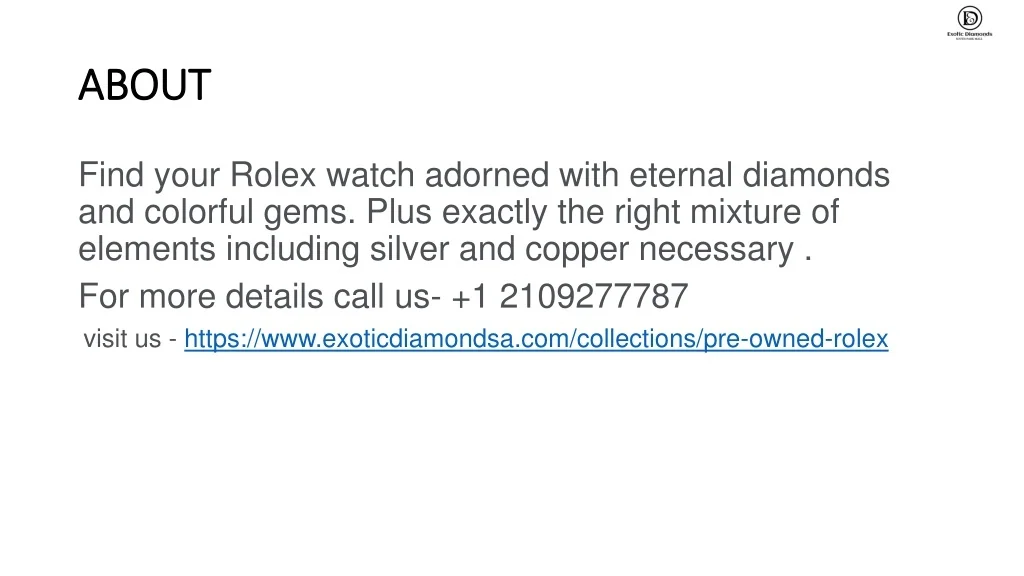 ABOUT Find your Rolex watch adorned with eternal diamonds and colorful gems. Plus exactly the right mixture of elements including silver and copper necessary . For more details call us- +1 2109277787 visit us - https://www.exoticdiamondsa.com/collections/pre-owned-rolex