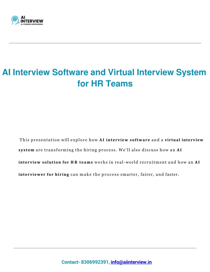 AIInterviewSoftwareandVirtualInterviewSystem forHRTeams ThispresentationwillexplorehowAIinterviewsoftwareandavirtualinterview systemaretransformingthehiringprocess.We’llalsodiscusshowanAI interviewsolutionforHRteamsworksinreal-worldrecruitmentandhowanAI interviewerforhiringcanmaketheprocesssmarter,fairer,andfaster. Contact-8306992391,info@aiinterview.in