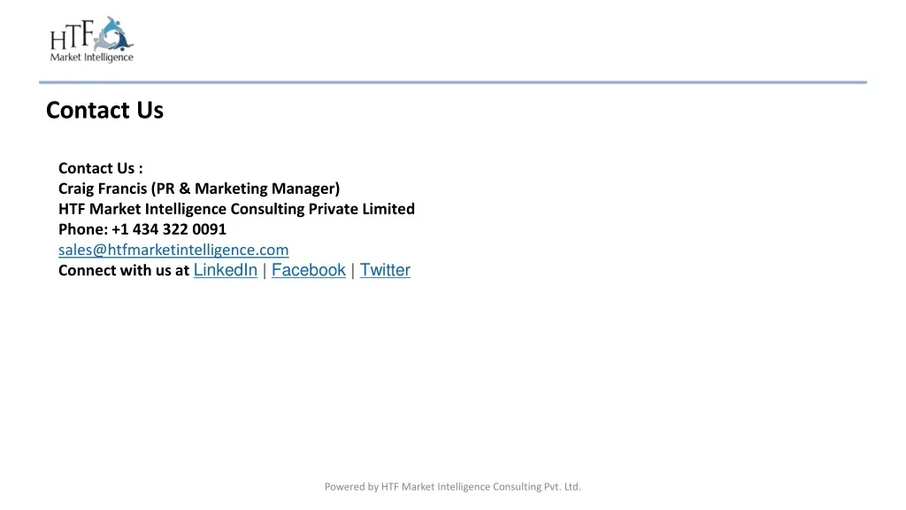 Contact Us Contact Us :Craig Francis (PR & Marketing Manager)HTF Market Intelligence Consulting Private LimitedPhone: +1 434 322 0091sales@htfmarketintelligence.comConnect with us atLinkedIn | Facebook | Twitter Powered by HTF Market Intelligence Consulting Pvt. Ltd.