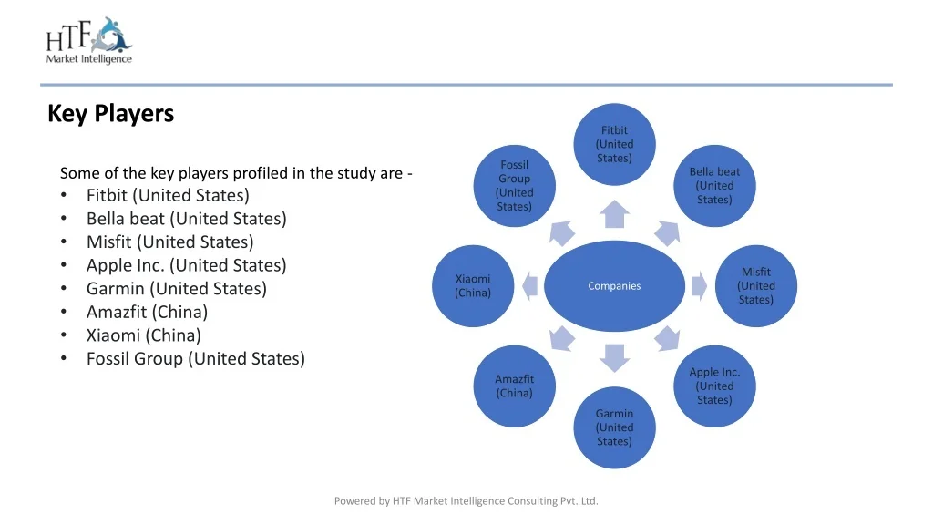 Key Players • Some of the key players profiled in the study are - • Fitbit (United States) • Bella beat (United States) • Misfit (United States) • Apple Inc. (United States) • Garmin (United States) • Amazfit (China) • Xiaomi (China) • Fossil Group (United States) Powered by HTF Market Intelligence Consulting Pvt. Ltd.