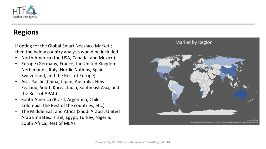 Regions • If opting for the Global Smart Necklace Market ; then the below country analysis would be included: • North America (the USA, Canada, and Mexico) • Europe (Germany, France, the United Kingdom, Netherlands, Italy, Nordic Nations, Spain, Switzerland, and the Rest of Europe) • Asia-Pacific (China, Japan, Australia, New Zealand, South Korea, India, Southeast Asia, and the Rest of APAC) • South America (Brazil, Argentina, Chile, Colombia, the Rest of the countries, etc.) • The Middle East and Africa (Saudi Arabia, United Arab Emirates, Israel, Egypt, Turkey, Nigeria, South Africa, Rest of MEA) Powered by HTF Market Intelligence Consulting Pvt. Ltd.