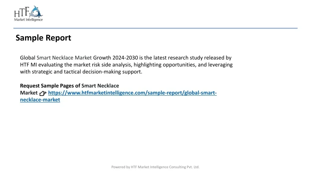 Sample Report Global Smart Necklace Market Growth 2024-2030 is the latest research study released by HTF MI evaluating the market risk side analysis, highlighting opportunities, and leveraging with strategic and tactical decision-making support. Request Sample Pages of Smart Necklace Market 👉 https://www.htfmarketintelligence.com/sample-report/global-smart-necklace-market Powered by HTF Market Intelligence Consulting Pvt. Ltd.