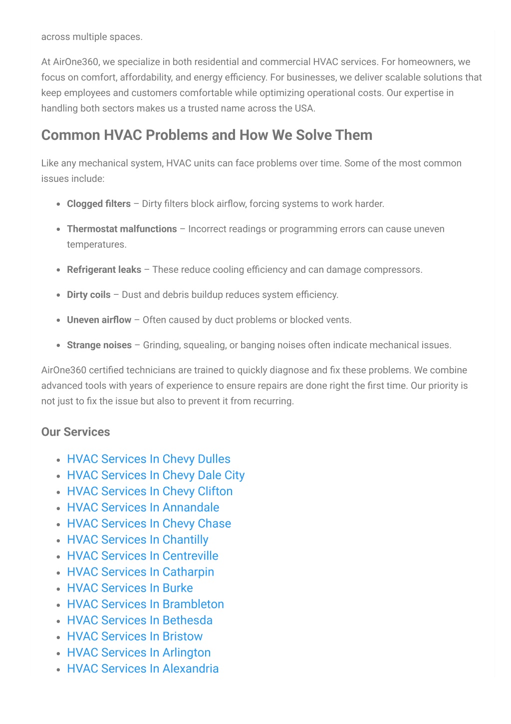 across multiple spaces. At AirOne360, we specialize in both residential and commercial HVAC services. For homeowners, we focus on comfort, affordability, and energy e?ciency. For businesses, we deliver scalable solutions that keep employees and customers comfortable while optimizing operational costs. Our expertise in handling both sectors makes us a trusted name across the USA. Common HVAC Problems and How We Solve Them Like any mechanical system, HVAC units can face problems over time. Some of the most common issues include: Clogged ?lters – Dirty ?lters block air?ow, forcing systems to work harder. Thermostat malfunctions – Incorrect readings or programming errors can cause uneven temperatures. Refrigerant leaks – These reduce cooling e?ciency and can damage compressors. Dirty coils – Dust and debris buildup reduces system e?ciency. Uneven air?ow – Often caused by duct problems or blocked vents. Strange noises – Grinding, squealing, or banging noises often indicate mechanical issues. AirOne360 certi?ed technicians are trained to quickly diagnose and ?x these problems. We combine advanced tools with years of experience to ensure repairs are done right the ?rst time. Our priority is not just to ?x the issue but also to prevent it from recurring. Our Services HVAC Services In Chevy Dulles HVAC Services In Chevy Dale City HVAC Services In Chevy Clifton HVAC Services In Annandale HVAC Services In Chevy Chase HVAC Services In Chantilly HVAC Services In Centreville HVAC Services In Catharpin HVAC Services In Burke HVAC Services In Brambleton HVAC Services In Bethesda HVAC Services In Bristow HVAC Services In Arlington HVAC Services In Alexandria