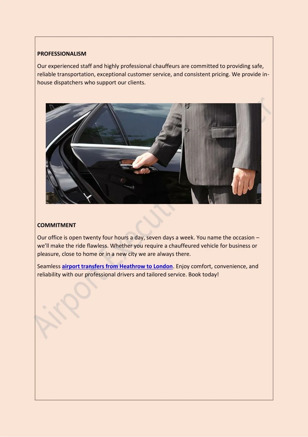 PROFESSIONALISM Our experienced staff and highly professional chauffeurs are committed to providing safe, reliable transportation, exceptional customer service, and consistent pricing. We provide in- house dispatchers who support our clients. COMMITMENT Our office is open twenty four hours a day, seven days a week. You name the occasion – we’ll make the ride flawless. Whether you require a chauffeured vehicle for business or pleasure, close to home or in a new city we are always there. Seamless airport transfers from Heathrow to London. Enjoy comfort, convenience, and reliability with our professional drivers and tailored service. Book today!