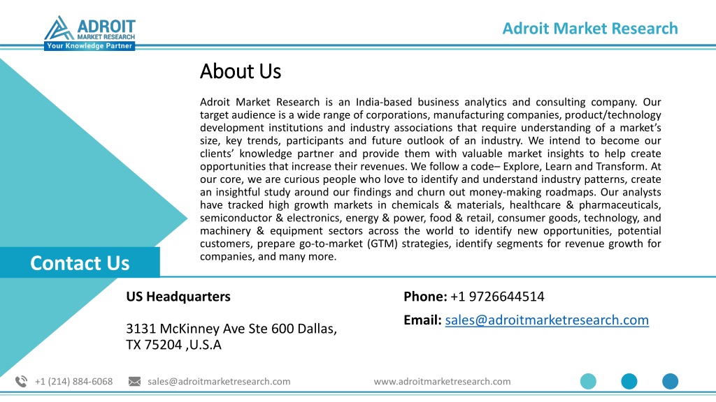 About Us Adroit Market Research is an India-based business analytics and consulting company. Our target audience is a wide range of corporations, manufacturing companies, product/technology development institutions and industry associations that require understanding of a market’s size, key trends, participants and future outlook of an industry. We intend to become our clients’ knowledge partner and provide them with valuable market insights to help create opportunities that increase their revenues. We follow a code– Explore, Learn and Transform. At our core, we are curious people who love to identify and understand industry patterns, create an insightful study around our findings and churn out money-making roadmaps. Our analysts have tracked high growth markets in chemicals & materials, healthcare & pharmaceuticals, semiconductor & electronics, energy & power, food & retail, consumer goods, technology, and machinery & equipment sectors across the world to identify new opportunities, potential customers, prepare go-to-market (GTM) strategies, identify segments for revenue growth for companies, and many more. US Headquarters3131 McKinney Ave Ste 600 Dallas, TX 75204 ,U.S.A Phone: +1 9726644514 Email: sales@adroitmarketresearch.com