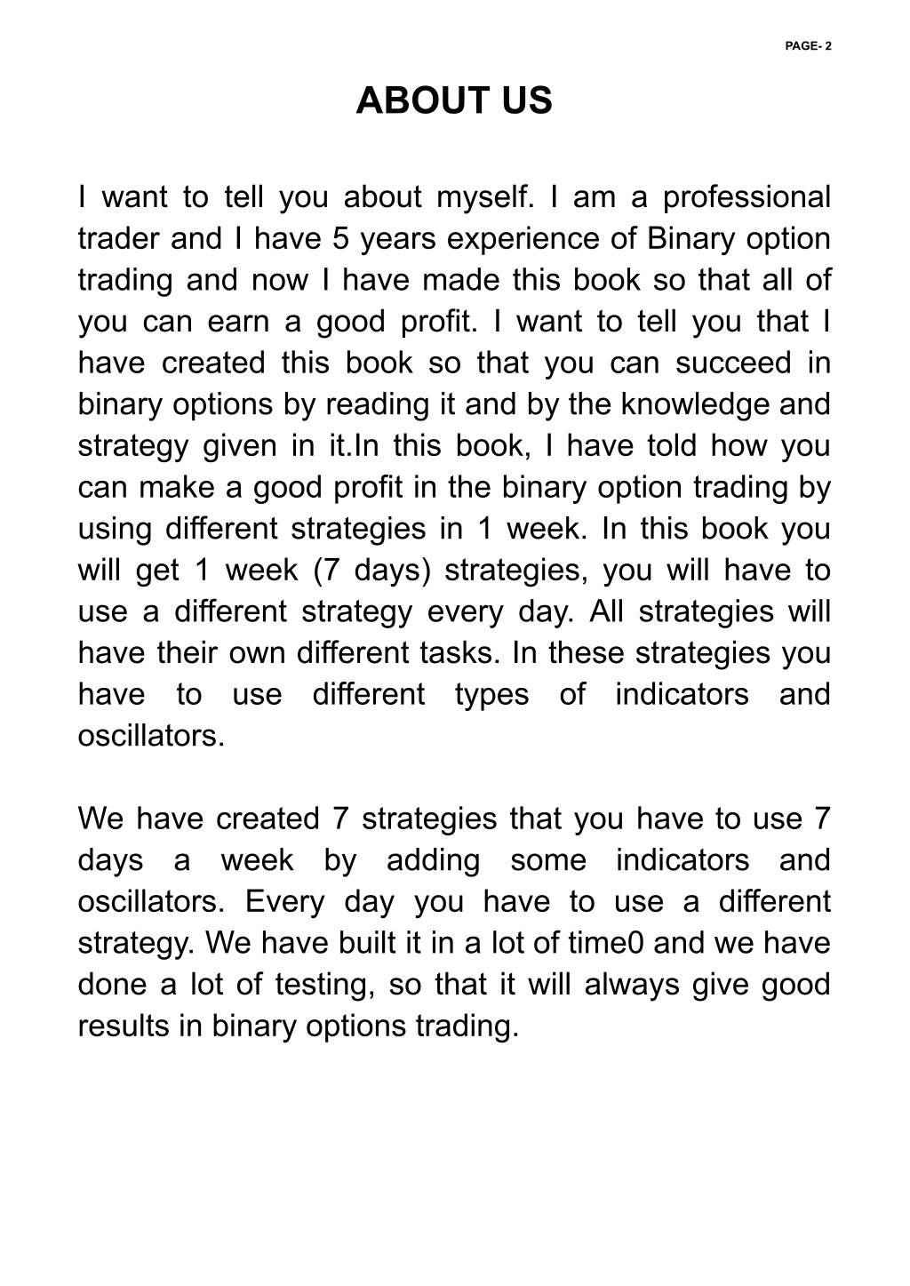 PAGE- 2 ABOUT US I want to tell you about myself. I am a professional trader and I have 5 years experience of Binary option trading and now I have made this book so that all of you can earn a good profit. I want to tell you that I have created this book so that you can succeed in binary options by reading it and by the knowledge and strategy given in it.In this book, I have told how you can make a good profit in the binary option trading by using different strategies in 1 week. In this book you will get 1 week (7 days) strategies, you will have to use a different strategy every day. All strategies will have their own different tasks. In these strategies you have to use different oscillators. types of indicators and We have created 7 strategies that you have to use 7 days a week by adding oscillators. Every day you have to use a different strategy. We have built it in a lot of time0 and we have done a lot of testing, so that it will always give good results in binary options trading. some indicators and