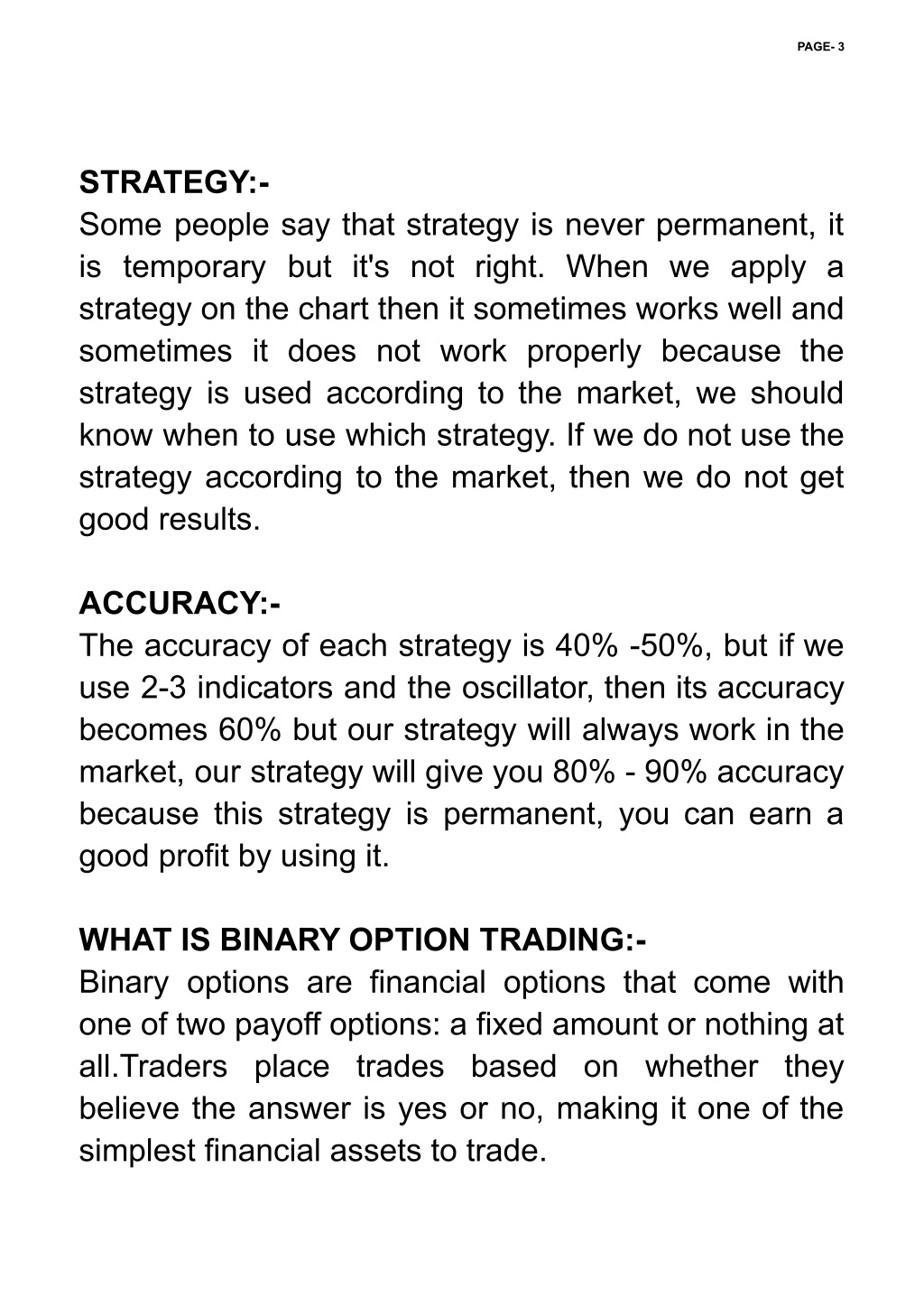 PAGE- 3 STRATEGY:- Some people say that strategy is never permanent, it is temporary but it's not right. When we apply a strategy on the chart then it sometimes works well and sometimes it does not work properly because the strategy is used according to the market, we should know when to use which strategy. If we do not use the strategy according to the market, then we do not get good results. ACCURACY:- The accuracy of each strategy is 40% -50%, but if we use 2-3 indicators and the oscillator, then its accuracy becomes 60% but our strategy will always work in the market, our strategy will give you 80% - 90% accuracy because this strategy is permanent, you can earn a good profit by using it. WHAT IS BINARY OPTION TRADING:- Binary options are financial options that come with one of two payoff options: a fixed amount or nothing at all.Traders place trades based on whether they believe the answer is yes or no, making it one of the simplest financial assets to trade.
