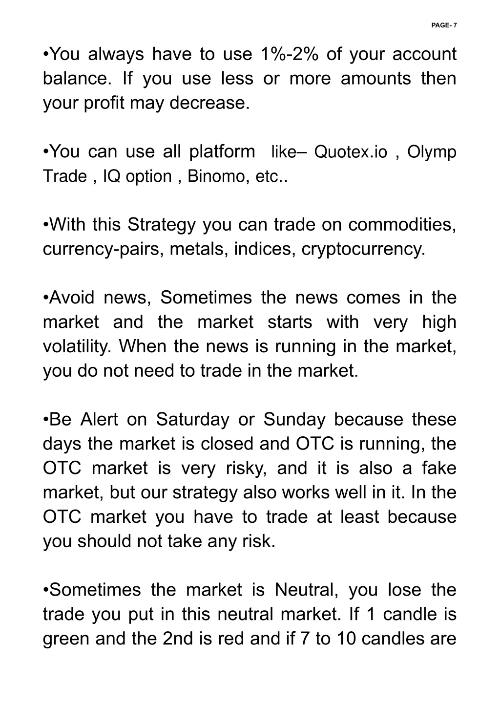 PAGE- 7 •You always have to use 1%-2% of your account balance. If you use less or more amounts then your profit may decrease. •You can use all platform ????– ??????.?? , ????? ????? , ???????? , ??????, ???.. •With this Strategy you can trade on commodities, currency-pairs, metals, indices, cryptocurrency. •Avoid news, Sometimes the news comes in the market and the market starts with very high volatility. When the news is running in the market, you do not need to trade in the market. •Be Alert on Saturday or Sunday because these days the market is closed and OTC is running, the OTC market is very risky, and it is also a fake market, but our strategy also works well in it. In the OTC market you have to trade at least because you should not take any risk. •Sometimes the market is Neutral, you lose the trade you put in this neutral market. If 1 candle is green and the 2nd is red and if 7 to 10 candles are