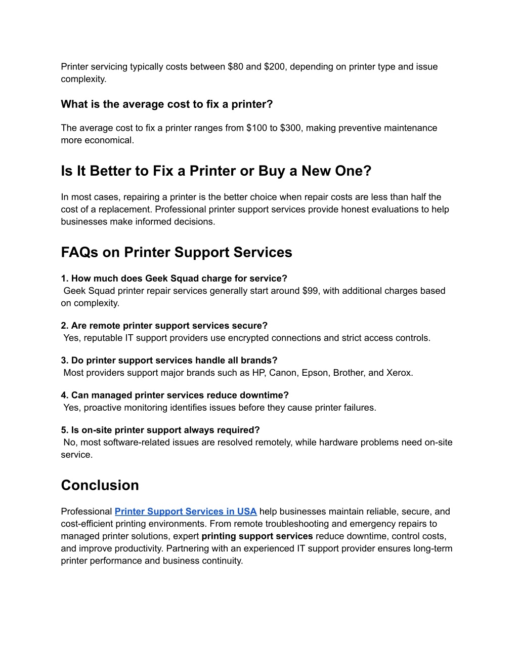 6. Printer servicing typically costs between $80 and $200, depending on printer type and issue complexity. What is the average cost to fix a printer? The average cost to fix a printer ranges from $100 to $300, making preventive maintenance more economical. Is It Better to Fix a Printer or Buy a New One? In most cases, repairing a printer is the better choice when repair costs are less than half the cost of a replacement. Professional printer support services provide honest evaluations to help businesses make informed decisions. FAQs on Printer Support Services 1. How much does Geek Squad charge for service? Geek Squad printer repair services generally start around $99, with additional charges based on complexity. 2. Are remote printer support services secure? Yes, reputable IT support providers use encrypted connections and strict access controls. 3. Do printer support services handle all brands? Most providers support major brands such as HP, Canon, Epson, Brother, and Xerox. 4. Can managed printer services reduce downtime? Yes, proactive monitoring identifies issues before they cause printer failures. 5. Is on-site printer support always required? No, most software-related issues are resolved remotely, while hardware problems need on-site service. Conclusion Professional Printer Support Services in USA help businesses maintain reliable, secure, and cost-efficient printing environments. From remote troubleshooting and emergency repairs to managed printer solutions, expert printing support services reduce downtime, control costs, and improve productivity. Partnering with an experienced IT support provider ensures long-term printer performance and business continuity.