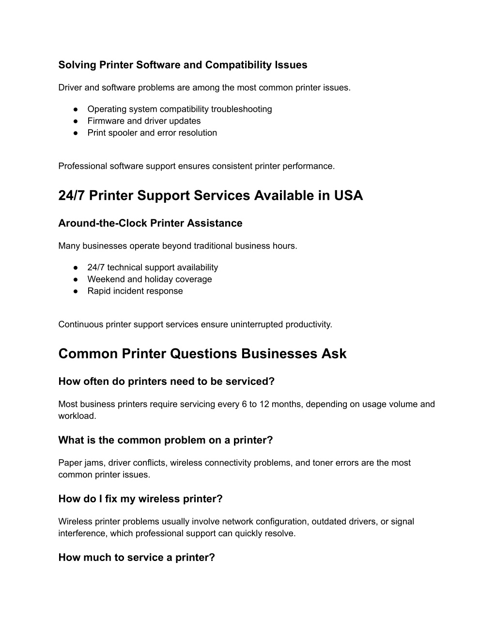 5. Solving Printer Software and Compatibility Issues Driver and software problems are among the most common printer issues. ● Operating system compatibility troubleshooting ● Firmware and driver updates ● Print spooler and error resolution Professional software support ensures consistent printer performance. 24/7 Printer Support Services Available in USA Around-the-Clock Printer Assistance Many businesses operate beyond traditional business hours. ● 24/7 technical support availability ● Weekend and holiday coverage ● Rapid incident response Continuous printer support services ensure uninterrupted productivity. Common Printer Questions Businesses Ask How often do printers need to be serviced? Most business printers require servicing every 6 to 12 months, depending on usage volume and workload. What is the common problem on a printer? Paper jams, driver conflicts, wireless connectivity problems, and toner errors are the most common printer issues. How do I fix my wireless printer? Wireless printer problems usually involve network configuration, outdated drivers, or signal interference, which professional support can quickly resolve. How much to service a printer?