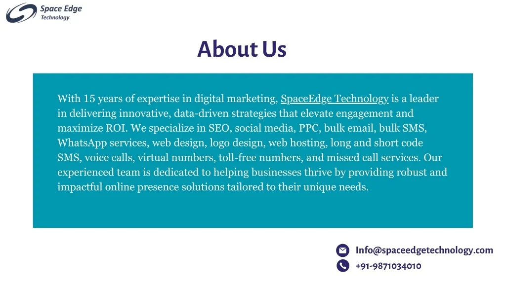 About Us With 15 years of expertise in digital marketing, SpaceEdge Technology is a leader in delivering innovative, data-driven strategies that elevate engagement and maximize ROI. We specialize in SEO, social media, PPC, bulk email, bulk SMS, WhatsApp services, web design, logo design, web hosting, long and short code SMS, voice calls, virtual numbers, toll-free numbers, and missed call services. Our experienced team is dedicated to helping businesses thrive by providing robust and impactful online presence solutions tailored to their unique needs. Info@spaceedgetechnology.com +91-9871034010