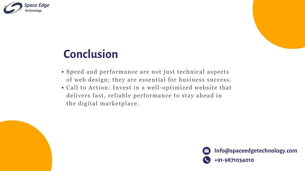 Conclusion Speed and performance are not just technical aspects of web design; they are essential for business success. Call to Action: Invest in a well-optimized website that delivers fast, reliable performance to stay ahead in the digital marketplace. Info@spaceedgetechnology.com +91-9871034010