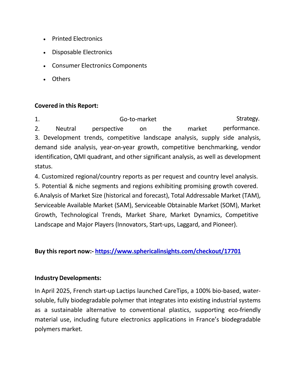 PrintedElectronics • DisposableElectronics • ConsumerElectronicsComponents • Others • CoveredinthisReport: Go-to-market Neutralperspectiveonthemarket Strategy. performance. Developmenttrends,competitivelandscapeanalysis,supplysideanalysis, demandsideanalysis,year-on-yeargrowth,competitivebenchmarking,vendor identification,QMIquadrant,andothersignificantanalysis,aswellasdevelopment status. Customizedregional/countryreportsasperrequestandcountrylevelanalysis. Potential&nichesegmentsandregionsexhibitingpromisinggrowthcovered. AnalysisofMarketSize(historicalandforecast),TotalAddressableMarket(TAM), ServiceableAvailableMarket(SAM),ServiceableObtainableMarket(SOM),Market Growth,TechnologicalTrends,MarketShare,MarketDynamics,Competitive LandscapeandMajorPlayers(Innovators,Start-ups,Laggard,andPioneer). Buythisreportnow:-https://www.sphericalinsights.com/checkout/17701 IndustryDevelopments: InApril2025,Frenchstart-upLactipslaunchedCareTips,a100%bio-based,water- soluble,fullybiodegradablepolymerthatintegratesintoexistingindustrialsystems asasustainablealternativetoconventionalplastics,supportingeco-friendly materialuse,includingfutureelectronicsapplicationsinFrance’sbiodegradable polymersmarket.