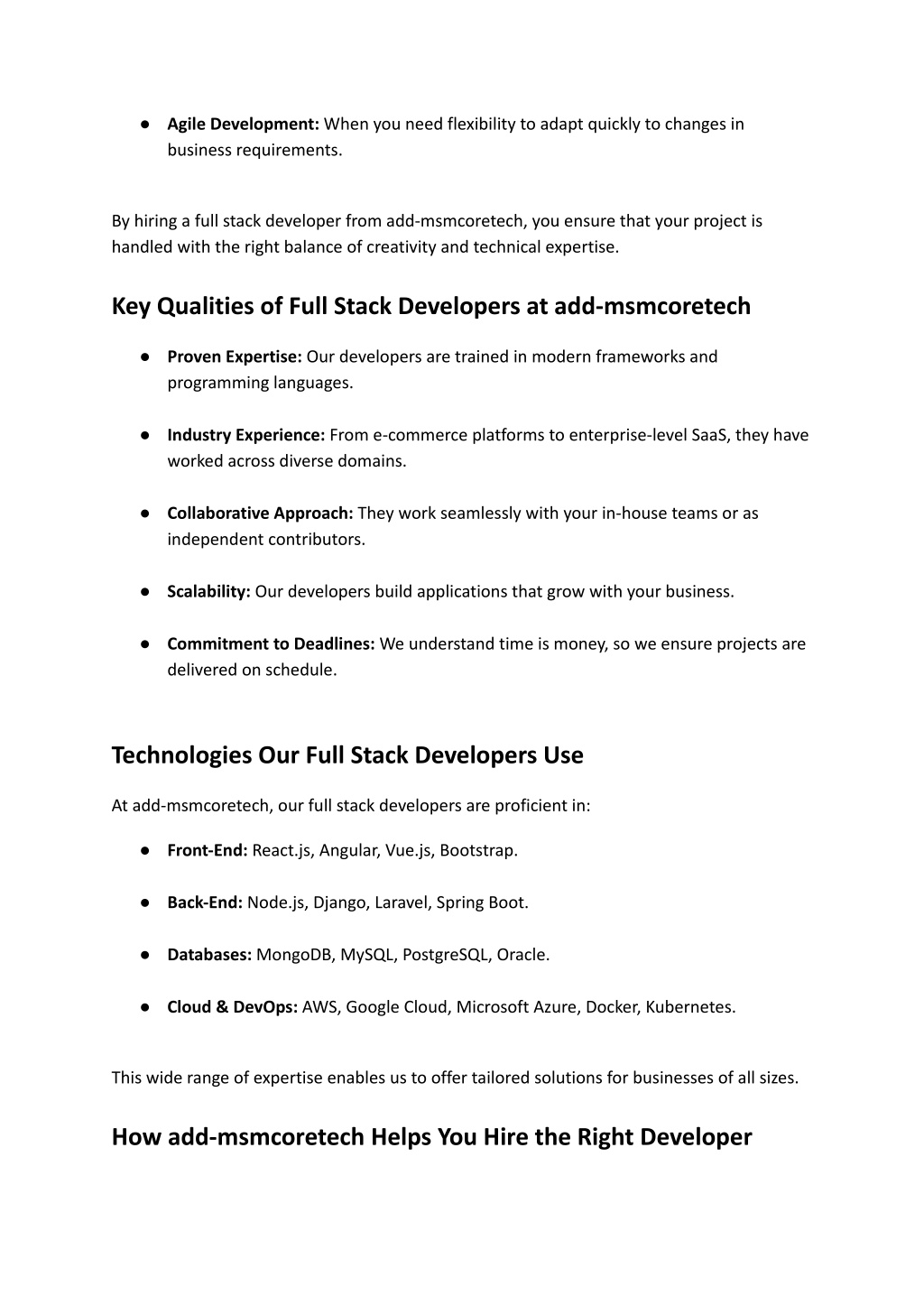 ● Agile Development: When you need flexibility to adapt quickly to changes in business requirements. By hiring a full stack developer from add-msmcoretech, you ensure that your project is handled with the right balance of creativity and technical expertise. Key Qualities of Full Stack Developers at add-msmcoretech ● Proven Expertise: Our developers are trained in modern frameworks and programming languages. ● Industry Experience: From e-commerce platforms to enterprise-level SaaS, they have worked across diverse domains. ● Collaborative Approach: They work seamlessly with your in-house teams or as independent contributors. ● Scalability: Our developers build applications that grow with your business. ● Commitment to Deadlines: We understand time is money, so we ensure projects are delivered on schedule. Technologies Our Full Stack Developers Use At add-msmcoretech, our full stack developers are proficient in: ● Front-End: React.js, Angular, Vue.js, Bootstrap. ● Back-End: Node.js, Django, Laravel, Spring Boot. ● Databases: MongoDB, MySQL, PostgreSQL, Oracle. ● Cloud & DevOps: AWS, Google Cloud, Microsoft Azure, Docker, Kubernetes. This wide range of expertise enables us to offer tailored solutions for businesses of all sizes. How add-msmcoretech Helps You Hire the Right Developer
