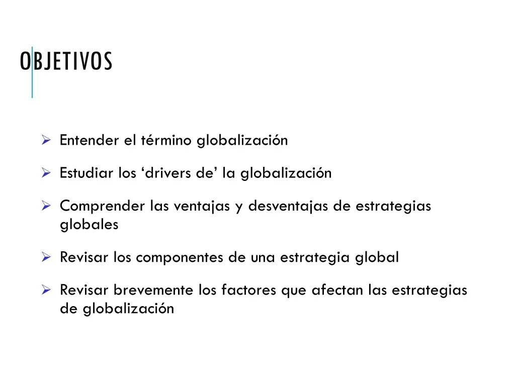 Objetivos • Entender el término globalización • Estudiar los ‘drivers de’ la globalización • Comprender las ventajas y desventajas de estrategias globales • Revisar los componentes de una estrategia global • Revisar brevemente los factores que afectan las estrategias de globalización