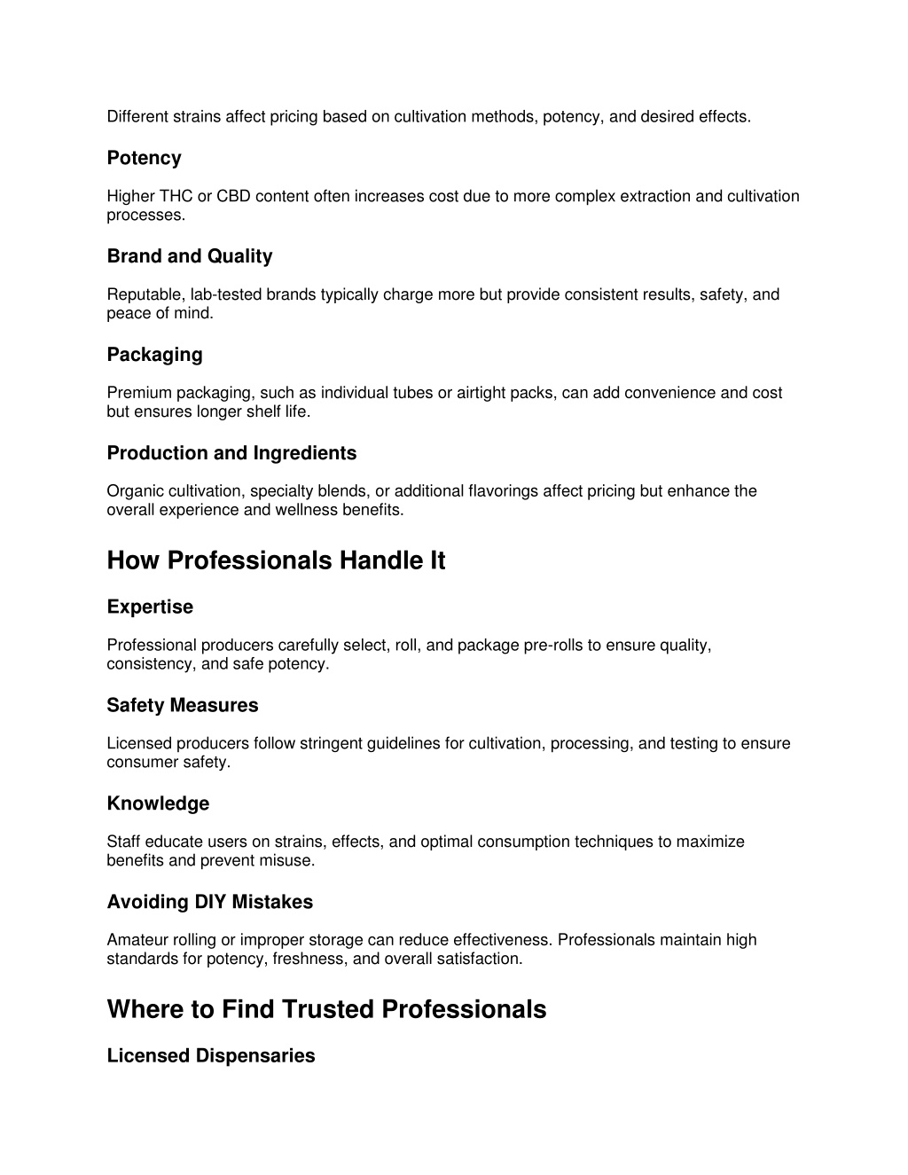 Different strains affect pricing based on cultivation methods, potency, and desired effects. Potency Higher THC or CBD content often increases cost due to more complex extraction and cultivation processes. Brand and Quality Reputable, lab-tested brands typically charge more but provide consistent results, safety, and peace of mind. Packaging Premium packaging, such as individual tubes or airtight packs, can add convenience and cost but ensures longer shelf life. Production and Ingredients Organic cultivation, specialty blends, or additional flavorings affect pricing but enhance the overall experience and wellness benefits. How Professionals Handle It Expertise Professional producers carefully select, roll, and package pre-rolls to ensure quality, consistency, and safe potency. Safety Measures Licensed producers follow stringent guidelines for cultivation, processing, and testing to ensure consumer safety. Knowledge Staff educate users on strains, effects, and optimal consumption techniques to maximize benefits and prevent misuse. Avoiding DIY Mistakes Amateur rolling or improper storage can reduce effectiveness. Professionals maintain high standards for potency, freshness, and overall satisfaction. Where to Find Trusted Professionals Licensed Dispensaries