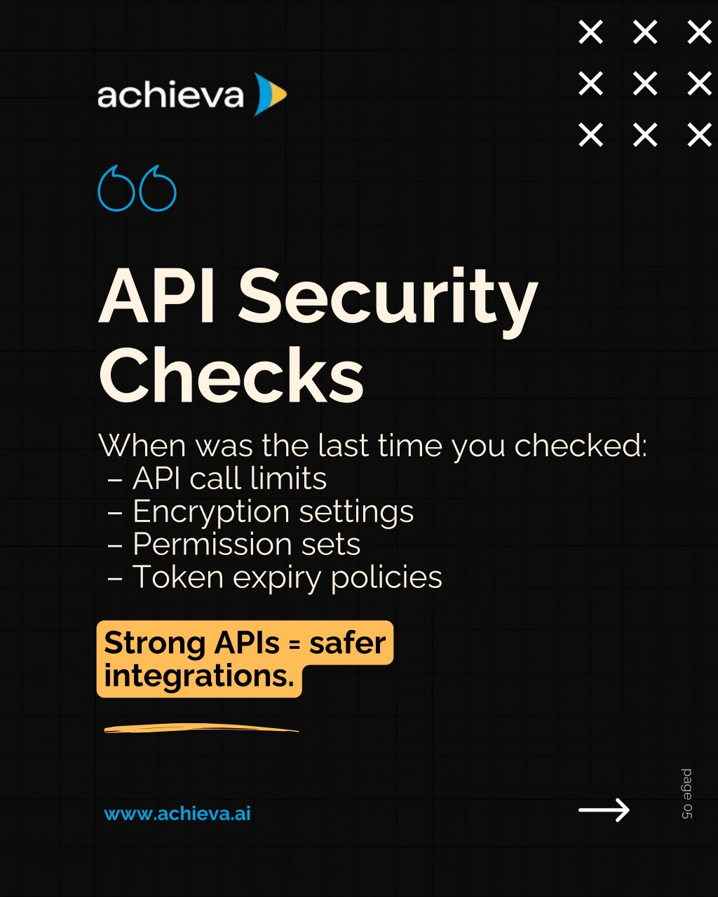 5. API Security Checks When was the last time you checked: – API call limits – Encryption settings – Permission sets – Token expiry policies Strong APIs = safer integrations. page 05 www.achieva.ai