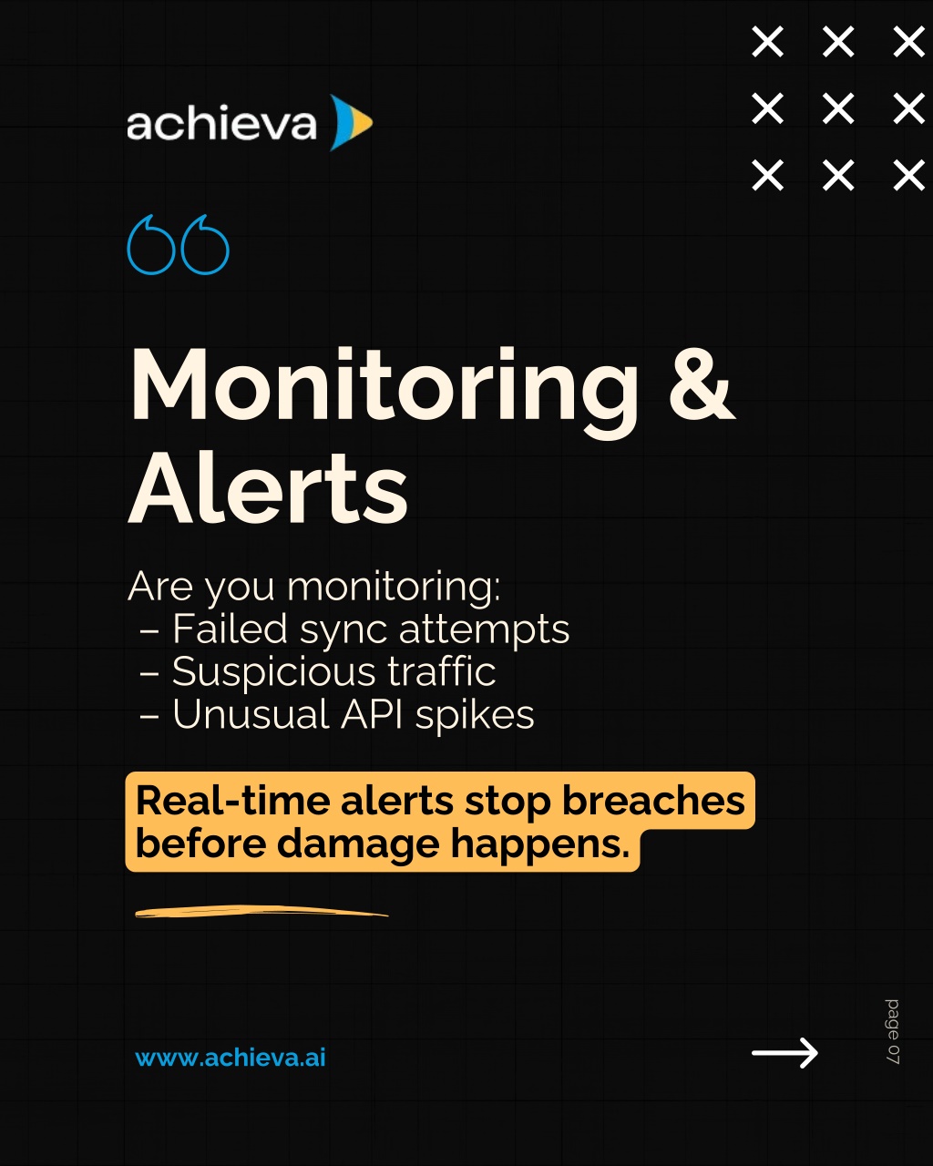 7. Monitoring & Alerts Are you monitoring: – Failed sync attempts – Suspicious traffic – Unusual API spikes Real-time alerts stop breaches before damage happens. page 07 www.achieva.ai