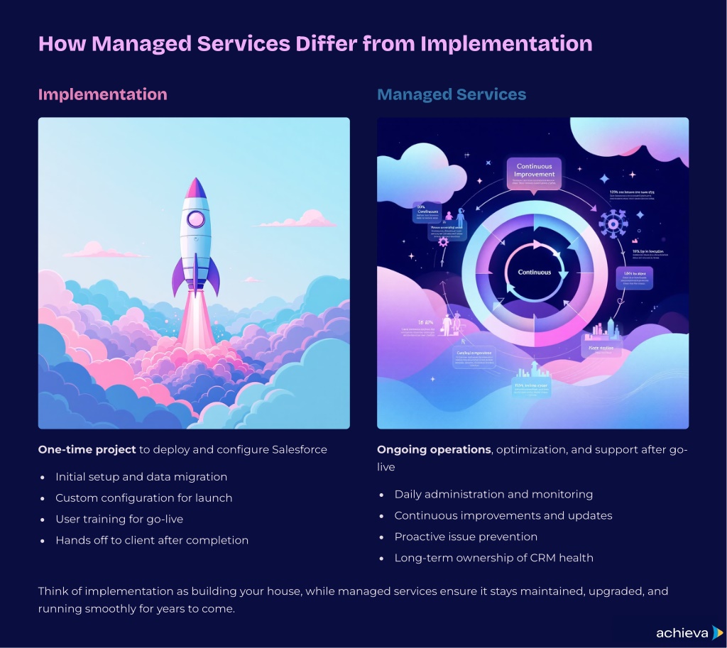 How Managed Services Differ from Implementation Implementation Managed Services One-time project to deploy and configure Salesforce Ongoing operations, optimization, and support after go- live Initial setup and data migration Daily administration and monitoring Custom configuration for launch Continuous improvements and updates User training for go-live Proactive issue prevention Hands off to client after completion Long-term ownership of CRM health Think of implementation as building your house, while managed services ensure it stays maintained, upgraded, and running smoothly for years to come.