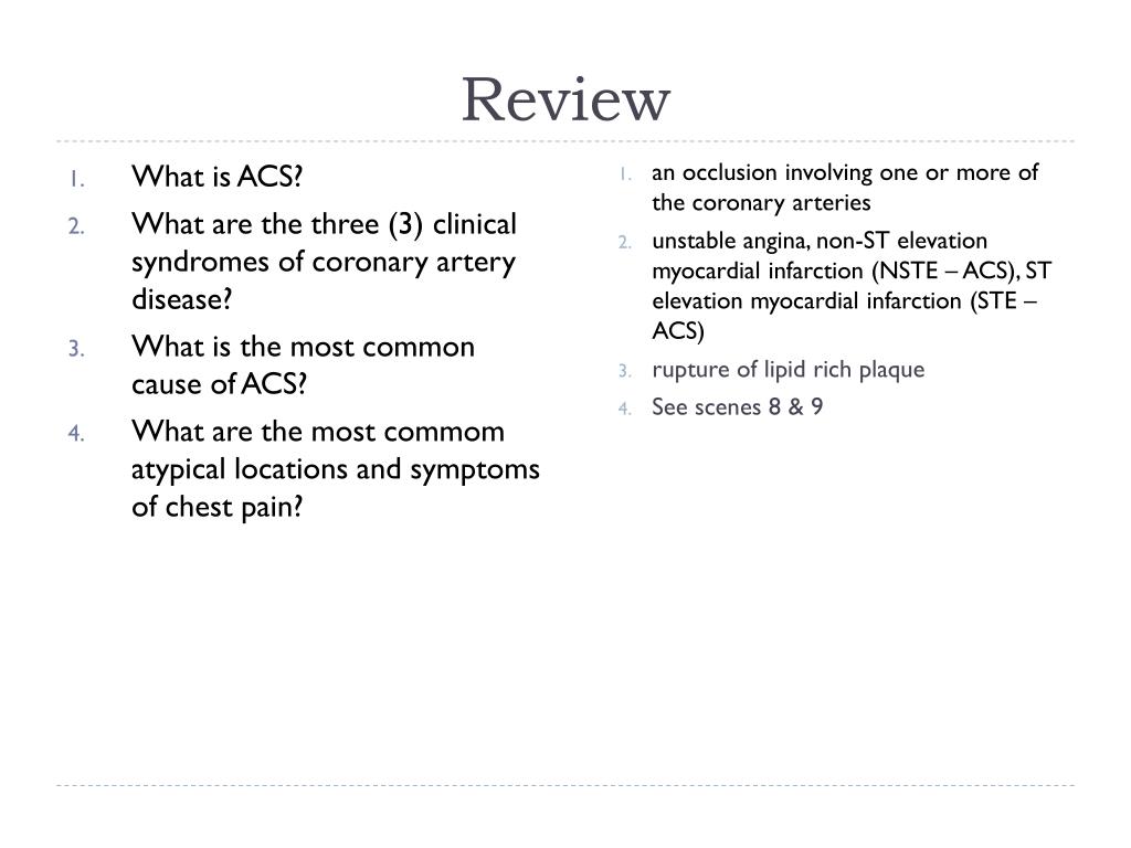 Review • What is ACS? • What are the three (3) clinical syndromes of coronary artery disease? • What is the most common cause of ACS? • What are the most commom atypical locations and symptoms of chest pain? • an occlusion involving one or more of the coronary arteries • unstable angina, non-ST elevation myocardial infarction (NSTE – ACS), ST elevation myocardial infarction (STE – ACS) • rupture of lipid rich plaque • See scenes 8 & 9
