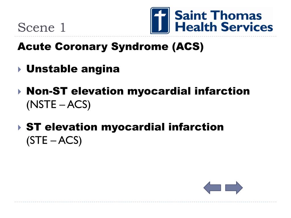 Scene 1 Acute Coronary Syndrome (ACS) • Unstable angina • Non-ST elevation myocardial infarction (NSTE – ACS) • ST elevation myocardial infarction (STE – ACS)