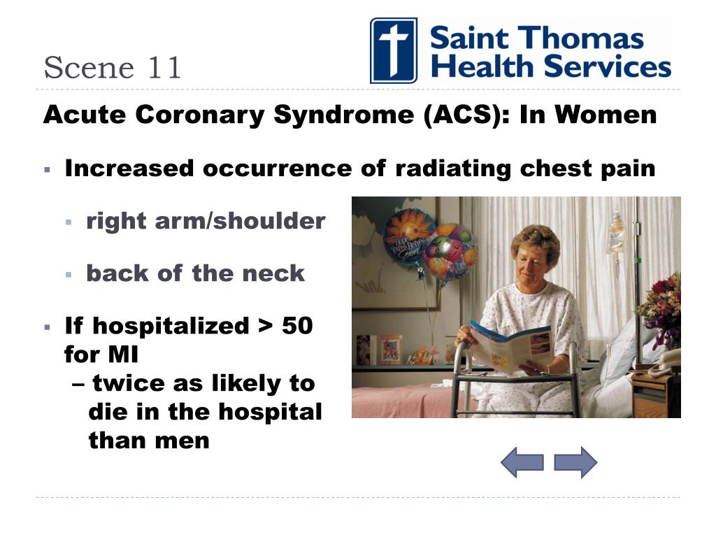 Scene 11 Acute Coronary Syndrome (ACS): In Women • Increased occurrence of radiating chest pain • right arm/shoulder • back of the neck • If hospitalized > 50 for MI – twice as likely to die in the hospital than men