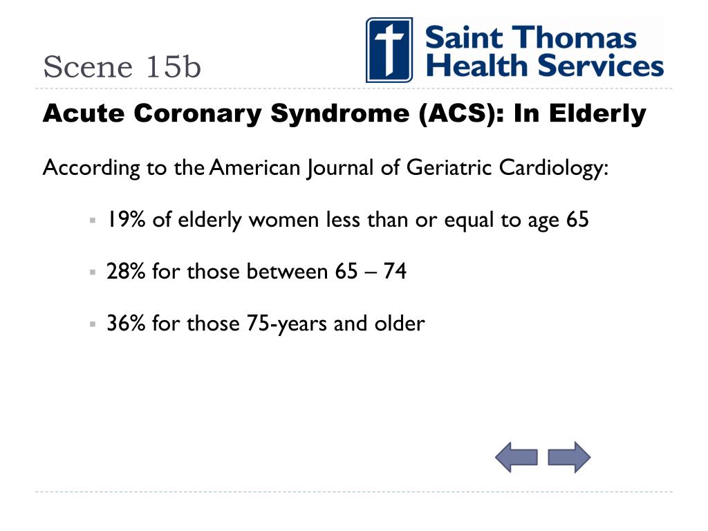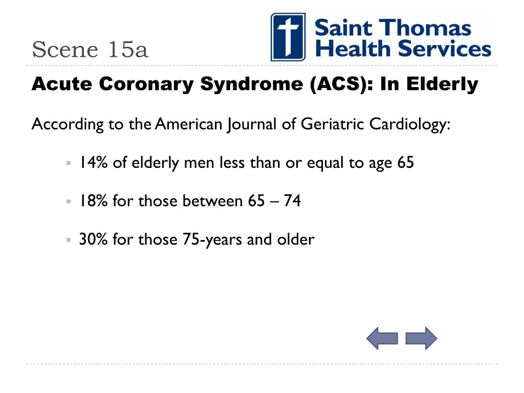 Scene 15b Acute Coronary Syndrome (ACS): In Elderly According to the American Journal of Geriatric Cardiology: • 19% of elderly women less than or equal to age 65 • 28% for those between 65 – 74 • 36% for those 75-years and older