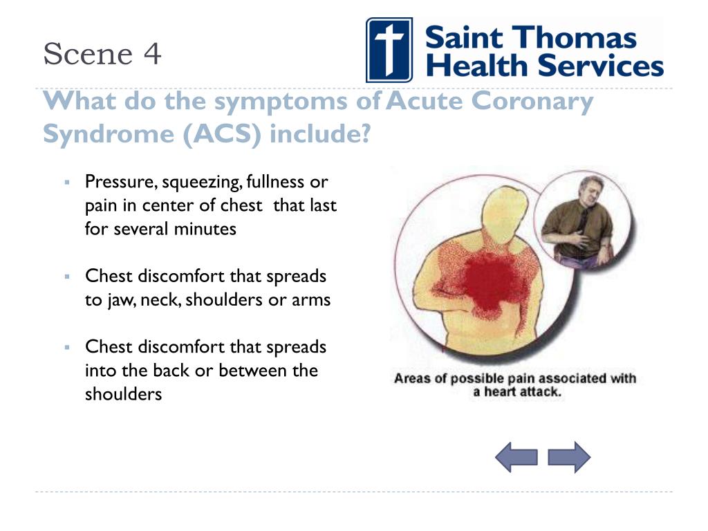 Scene 4 What do the symptoms of Acute Coronary Syndrome (ACS) include? • Pressure, squeezing, fullness or pain in center of chest that last for several minutes • Chest discomfort that spreads to jaw, neck, shoulders or arms • Chest discomfort that spreads into the back or between the shoulders