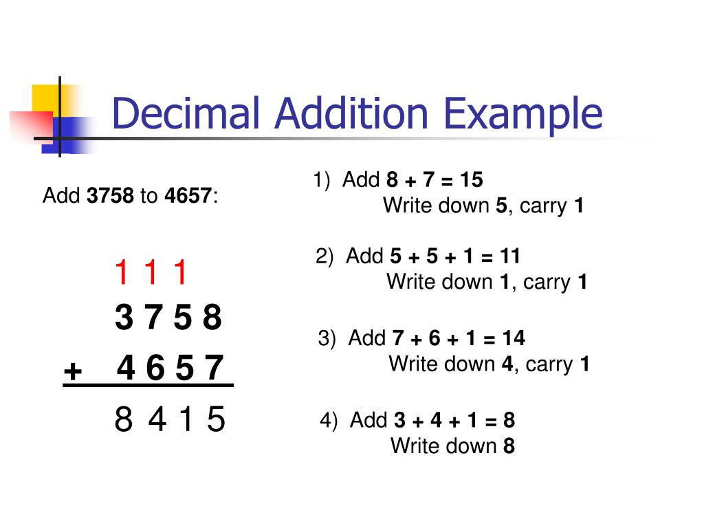 Binary Operations. Math/Logical. Binary Math. Decimal Addition Example. 3 7 5 8 + 4 6 5 7 . 1) Add 8 + 7 = 15 Write down 5 , carry 1. Add 3758 to 4657 :. 2) Add 5 + 5 + 1 = 11 Write down 1 , carry 1. 1. 1. 1. 3) Add 7 + 6 + 1 = 14 Write down 4 , carry 1. 8. 4.