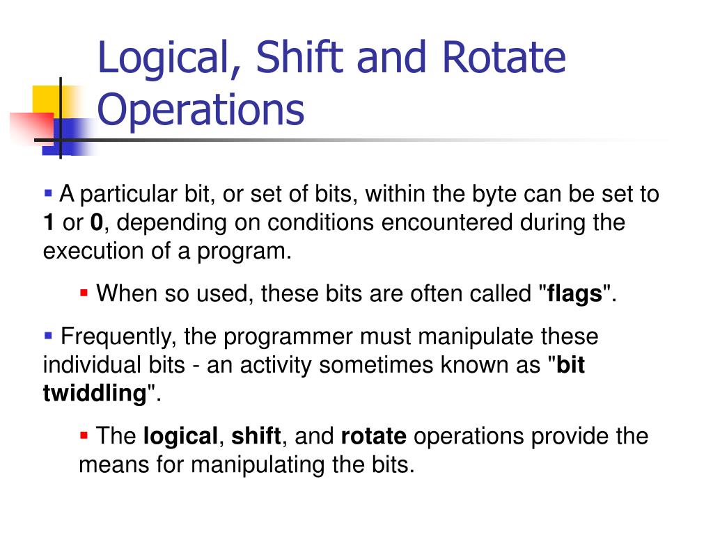 Logical, Shift and Rotate Operations • A particular bit, or set of bits, within the byte can be set to 1 or 0, depending on conditions encountered during the execution of a program. • When so used, these bits are often called "flags". • Frequently, the programmer must manipulate these individual bits - an activity sometimes known as "bit twiddling". • The logical, shift, and rotate operations provide the means for manipulating the bits.