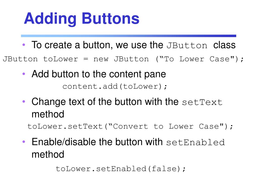 Adding Buttons • To create a button, we use the JButton class • Add button to the content pane • Change text of the button with the setText method • Enable/disable the button with setEnabled method JButton toLower = new JButton (“To Lower Case"); content.add(toLower); toLower.setText(“Convert to Lower Case"); toLower.setEnabled(false);
