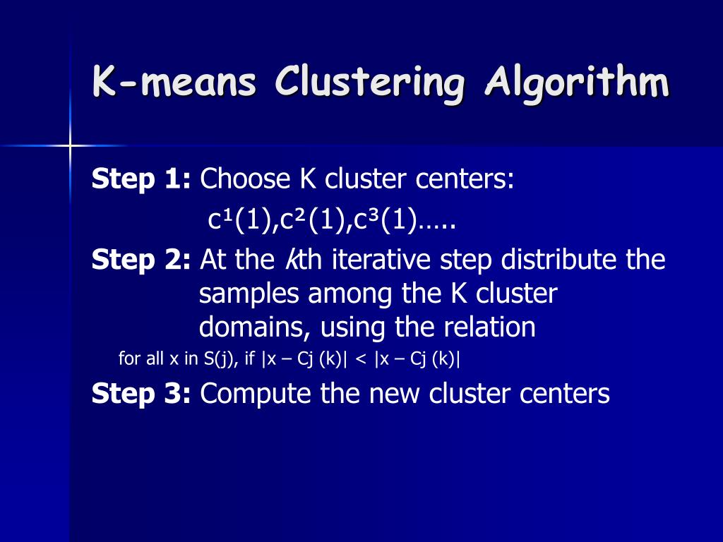 K-means Clustering Algorithm Step 1: Choose K cluster centers: c¹(1),c² (1),c³(1)….. Step 2: At the kth iterative step distribute the samples among the K cluster domains, using the relation for all x in S(j), if |x – Cj (k)| < |x – Cj (k)| Step 3: Compute the new cluster centers