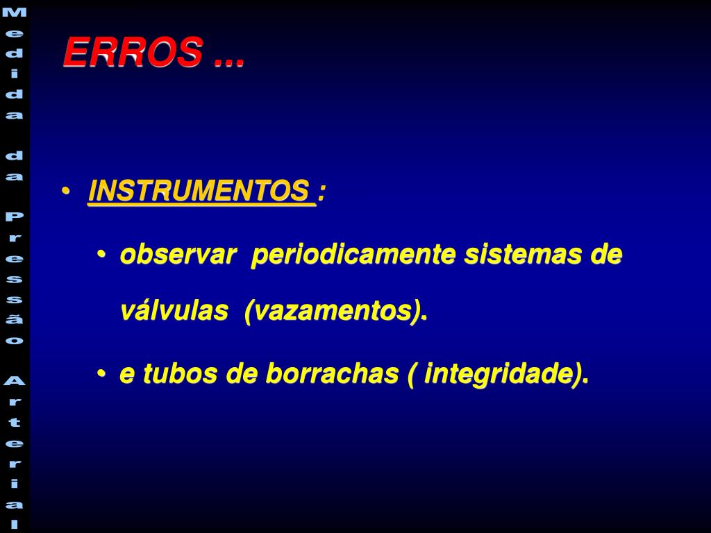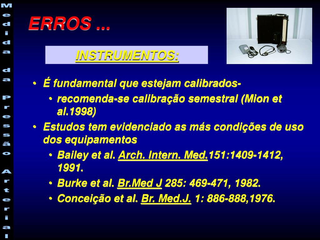 É fundamental que estejam calibrados- recomenda-se calibração semestral (Mion et al.1998) Estudos tem evidenciado as más condições de uso dos equipamentos Bailey et al. Arch. Intern. Med.151:1409-1412, 1991. Burke et al. Br.Med J 285: 469-471, 1982. Conceição et al. Br. Med.J. 1: 886-888,1976. ERROS ... INSTRUMENTOS: