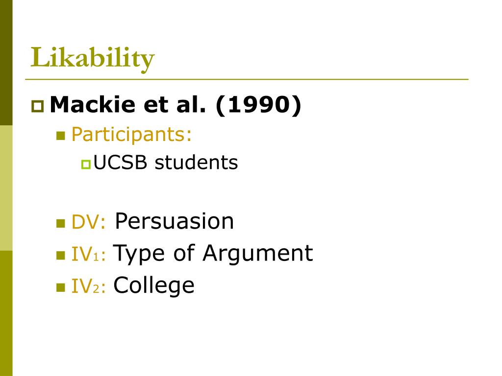 Likability • Mackie et al. (1990) • Participants: • UCSB students • DV:Persuasion • IV1: Type of Argument • IV2: College