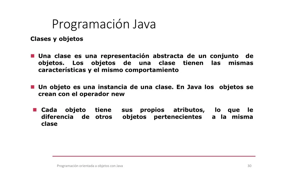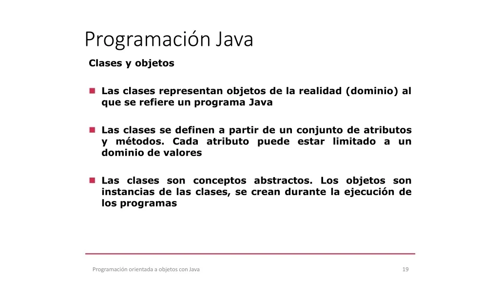 ProgramaciónJava • Clases yobjetos • Las clases representan objetos de la realidad (dominio) al que se refiere un programaJava • Las clases se definen a partir de un conjunto de atributos y métodos. Cada atributo puede estar limitado a un dominio devalores • Las clases son conceptos abstractos. Los objetos son instancias de las clases, se crean durante la ejecución de losprogramas Programación orientada a objetos conJava