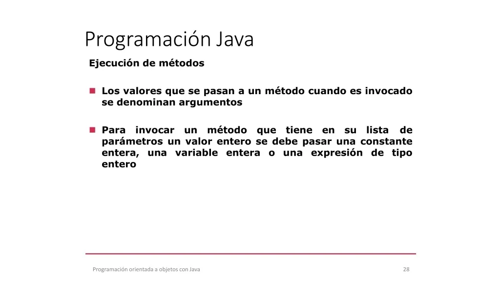 ProgramaciónJava • Ejecución de métodos • Los valores que se pasan a un método cuando es invocado se denominanargumentos • Para invocar un método que tiene en su listade parámetros un valor entero se debe pasar una constante entera, una variable entera o una expresión de tipo entero Programación orientada a objetos conJava