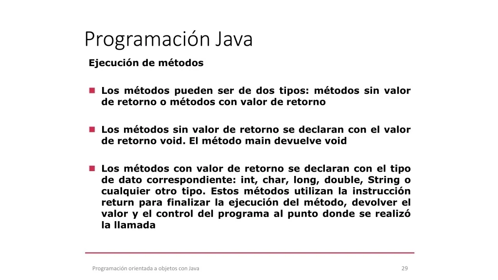 ProgramaciónJava • Ejecución de métodos • Los métodos pueden ser de dos tipos: métodos sin valor de retorno o métodos con valor deretorno • Los métodos sin valor de retorno se declaran con el valor de retorno void. El método main devuelvevoid • Los métodos con valor de retorno se declaran con el tipo de dato correspondiente: int, char, long, double, String o cualquier otro tipo. Estos métodos utilizan la instrucción return para finalizar la ejecución del método, devolver el valor y el control del programa al punto donde se realizó la llamada Programación orientada a objetos conJava