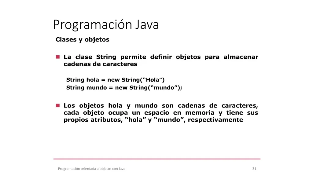 ProgramaciónJava • Clases yobjetos • La clase String permite definir objetos para almacenar cadenas decaracteres • String hola = new String(“Hola″) String mundo = newString(“mundo”); • Los objetos hola y mundo son cadenas de caracteres, cada objeto ocupa un espacio en memoria y tiene sus propios atributos, “hola” y “mundo”, respectivamente Programación orientada a objetos conJava