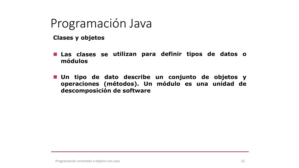 ProgramaciónJava • Clases yobjetos • Lasclasesse módulos utilizan para definir tipos de datos o • Untipo de dato describe un conjunto de objetos y operaciones(métodos).Un módulo esuna unidadde descomposición desoftware Programación orientada a objetos conJava