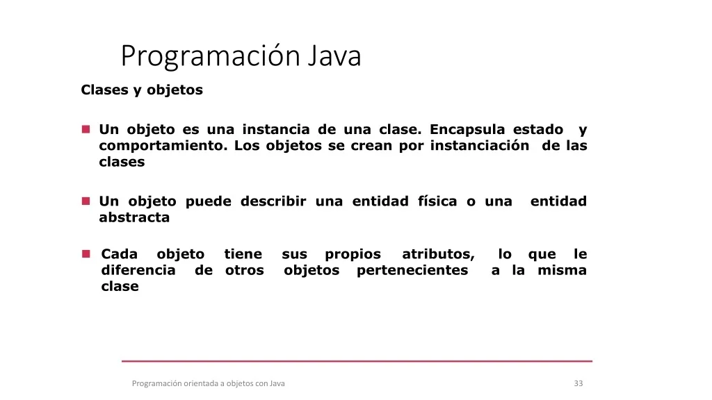ProgramaciónJava • Clases yobjetos • Un objeto es una instancia de una clase. Encapsula estado y comportamiento. Los objetos se crean por instanciación de las clases • Un objeto puede describir una entidad física o una entidadabstracta Programación orientada a objetos conJava
