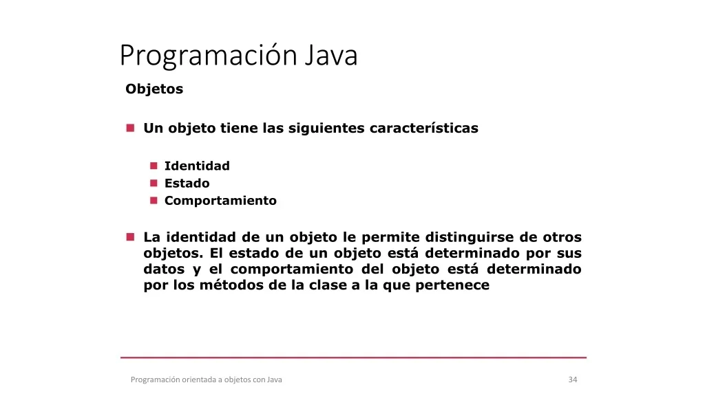 ProgramaciónJava • Objetos • Un objeto tiene las siguientescaracterísticas • Identidad • Estado • Comportamiento • La identidad de un objeto le permite distinguirse de otros objetos. El estado de un objeto está determinado por sus datos y el comportamiento del objeto está determinado por los métodos de la clase a la quepertenece Programación orientada a objetos conJava
