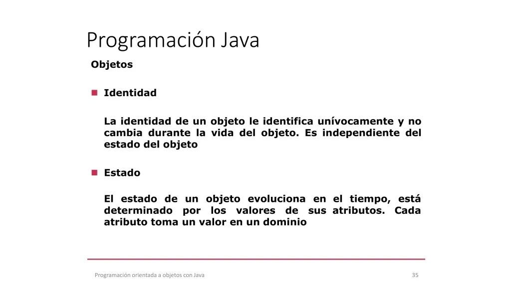 ProgramaciónJava • Objetos • Identidad • La identidad de un objeto le identifica unívocamente y no cambia durante la vida del objeto. Es independiente del estado delobjeto • Estado El estado de un objeto evoluciona en determinado por los valores de sus atributo toma un valor en undominio el tiempo,está atributos.Cada Programación orientada a objetos conJava