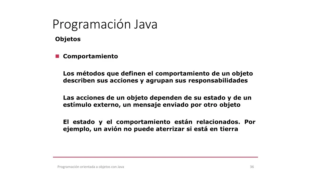 ProgramaciónJava • Objetos • Comportamiento • Los métodos que definen el comportamiento de un objeto describen sus acciones y agrupan susresponsabilidades • Las acciones de un objeto dependen de su estado y de un estímulo externo, un mensaje enviado por otroobjeto • El estado y el comportamiento están relacionados.Por ejemplo, un avión no puede aterrizar si está entierra Programación orientada a objetos conJava