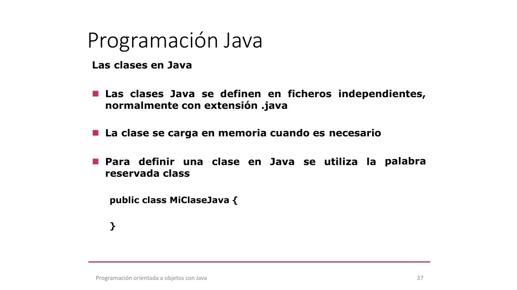 ProgramaciónJava • Las clases enJava • LasclasesJava se definenenficherosindependientes, normalmente con extensión.java • La clase se carga en memoria cuando esnecesario • Para definiruna clase enJava se utiliza la reservada class palabra public class MiClaseJava{ } Programación orientada a objetos conJava